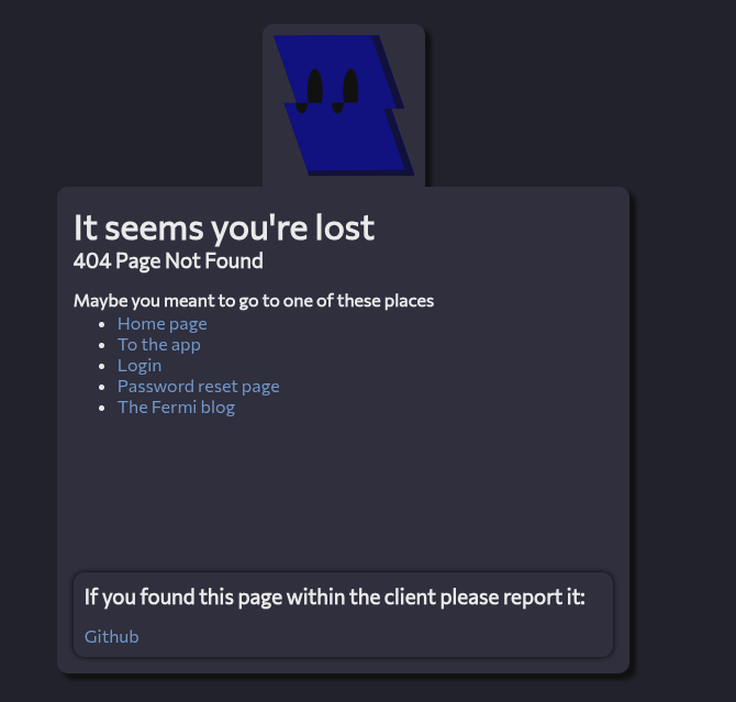 Now if you visit an invalid page on Fermi, the 404 page should result! It'll also present users with links to various parts of Fermi so that way users will be able to navigate where they meant to go.